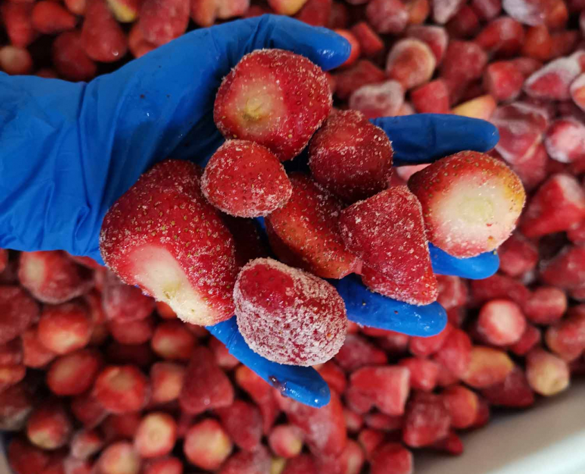 Por ejemplo, si utilizáramos un congelador IQF para congelar un lote de bayas, éstas no se agruparían y congelarían juntas. En su lugar, cada baya individual estaría separada dentro del lote. Esto hace que sea mucho más fácil congelar y almacenar individualmente productos como melocotones, bayas, guisantes, pescado, gambas y aves de corral.